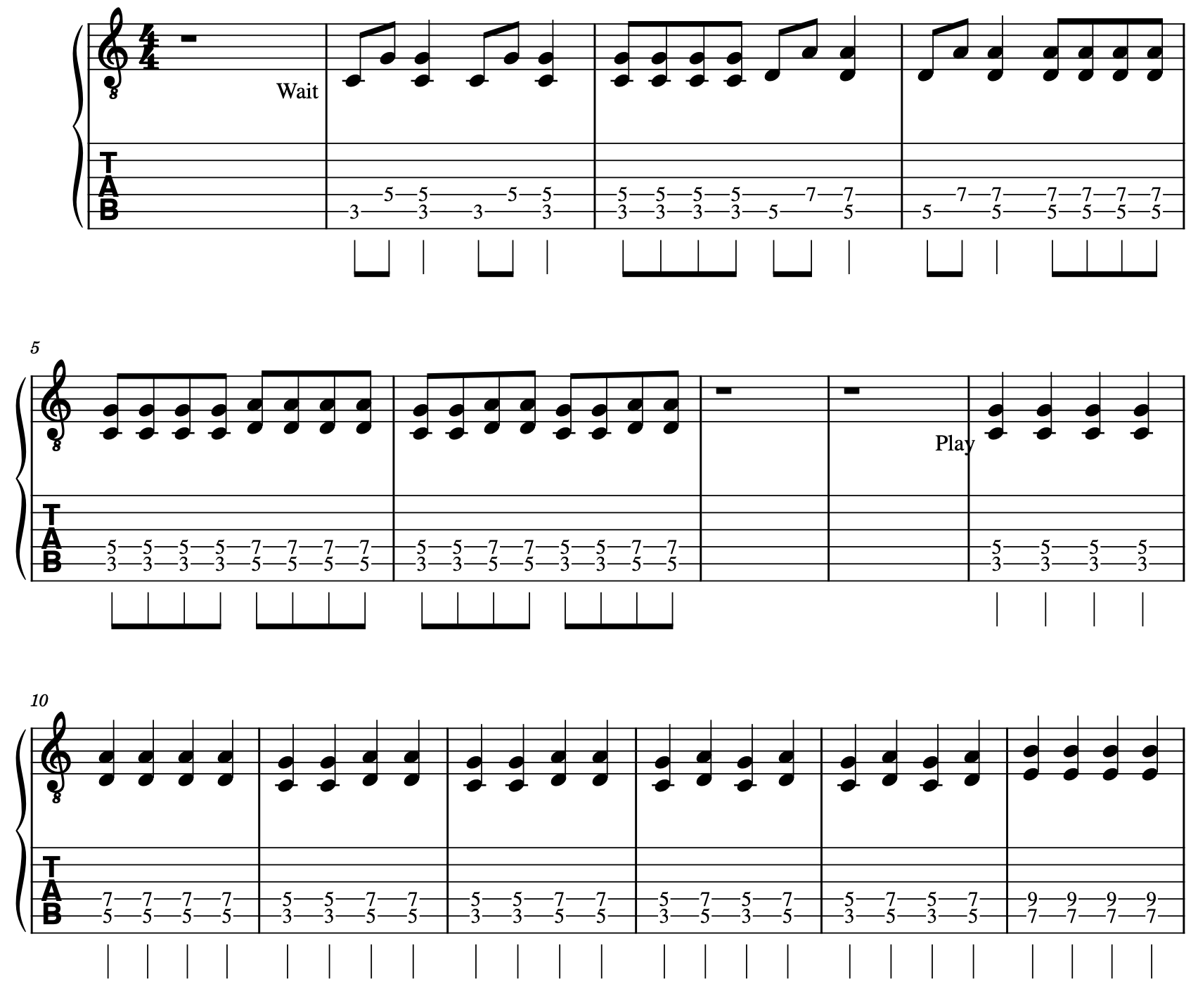 Exercise 1: Start with a 2 note power chord playing one note at a time, then at the same time with the roots at the 3rd and 5th fret. Play these power chords in time going back and forth 4 times each, then 2 times, then once.